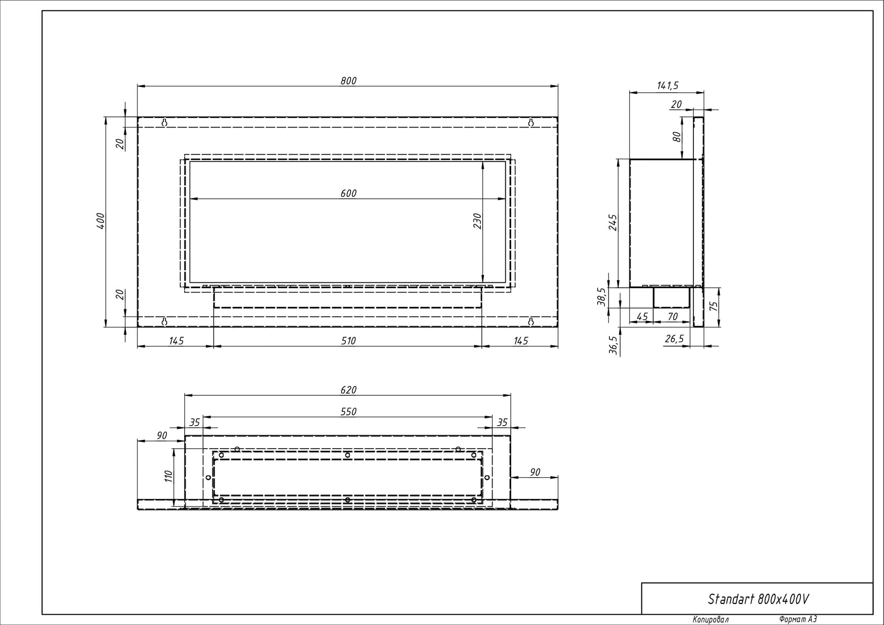 Встраиваемый биокамин «Голд 800V» изготовлен из стали и нержавеющей стали, окрашен термостойкой порошковой краской.