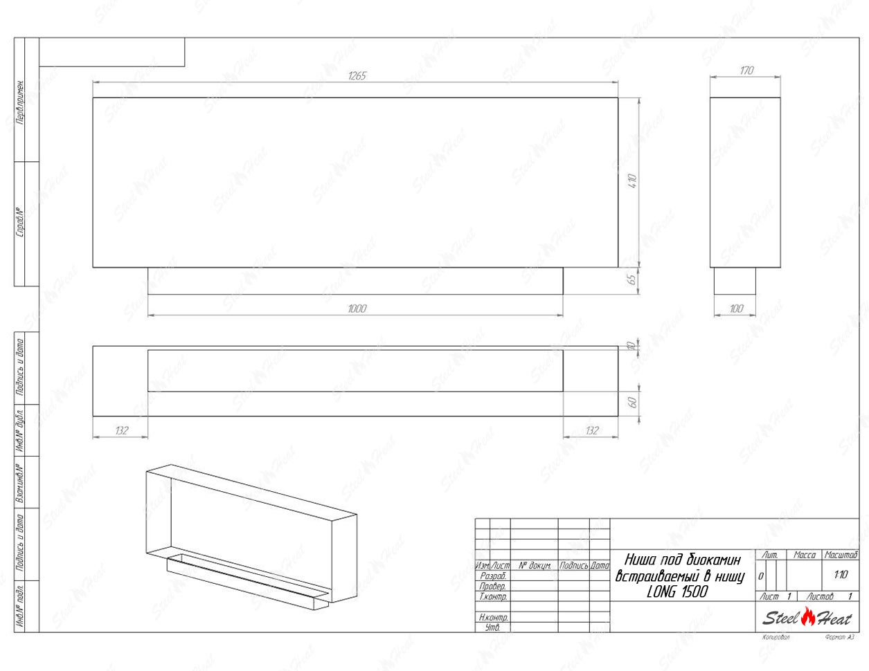 Встраиваемый Биокамин SteelHeat LONG-H 1500 предназначен для встраивания в глухие ниши из гипсокартона, кирпича, пеноблоков, бетона.